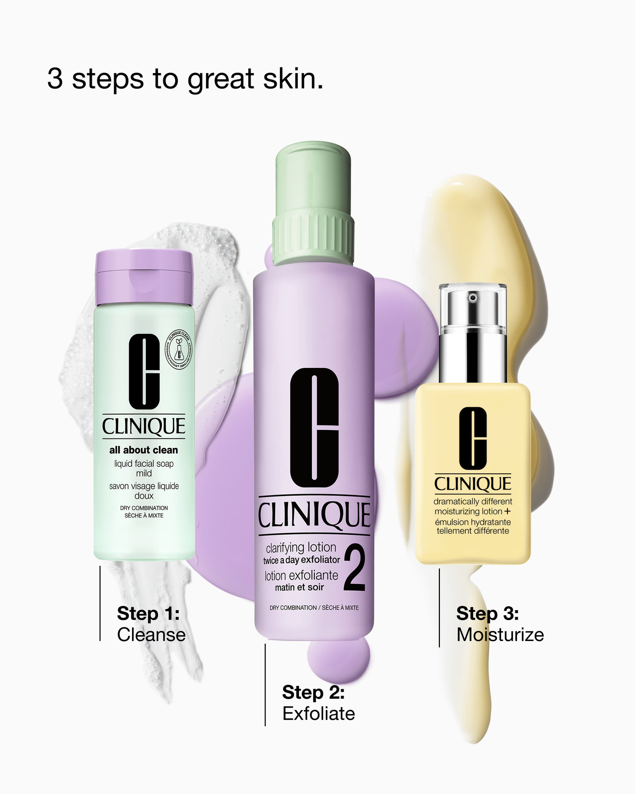 The secret's in the system.Our revolutionary 3-Step Skin Care System was created by a celebrated dermatologist.It's simple, customised and takes just three minutes, twice a day: cleanse with Facial Soap, exfoliate with Clarifying Lotion, moisturise with Dramatically Different Moisturising Lotion+, oil-free Gel or lightweight Jelly.