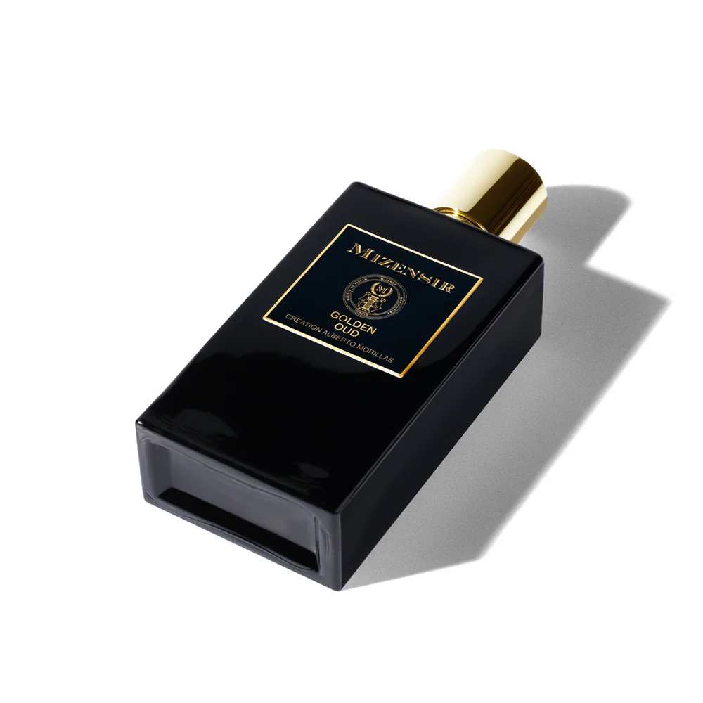 Housed in an opaque black lacquered glass bottle by Pochet du Courval, featuring a black aluminum plate laser-engraved with the Mizensir name and fragrance. The bottle is topped with a bright gold galvanized zamak cap with engraving and an anodized aluminum collar, reflecting the luxurious and enigmatic nature of the scent.