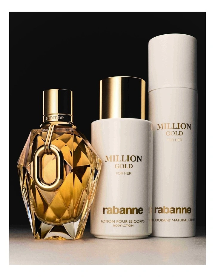 Radiating ecstatic energy, Million Gold for Her celebrates the thrill of golden success. This innovative Grand Floral scent juxtaposes metallic rose oxide with fiercely feminine white florals, all anchored by a salty mineral musk accord for an intoxicatingly sensual aura.